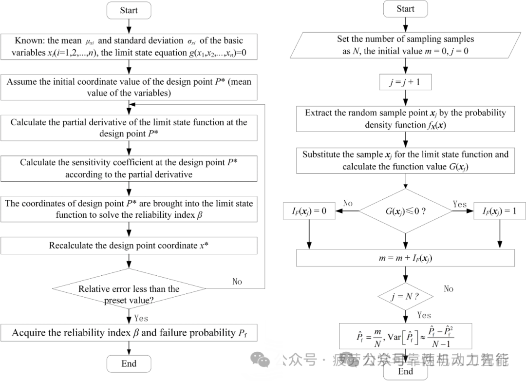 1)近似解析法/数字仿真法:该综述系统地介绍了一次可靠性法、二次可靠性法等近似解析方法和以蒙特卡洛法为代表的数字模拟方法。对于航空发动机转子系统可靠性分析问题,近似解析法存在难以*逼近概率密度函数尾部特征的缺陷,数字仿真法因需大量调用真实非线性极限状态函数而易于陷入计算效率低的困扰。图1给出了两种方法详细的可靠性分析流程。