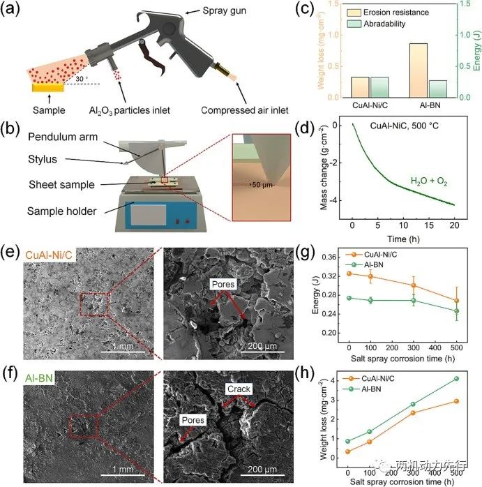 ▲图1.(a)两种封严涂层综合力学性能评价(b)CuAl-Ni/C涂层的高温性能评价(c-d)两种封严涂层盐雾试验后表面形貌(e-f)两种封严涂层腐蚀后综合力学性能评价