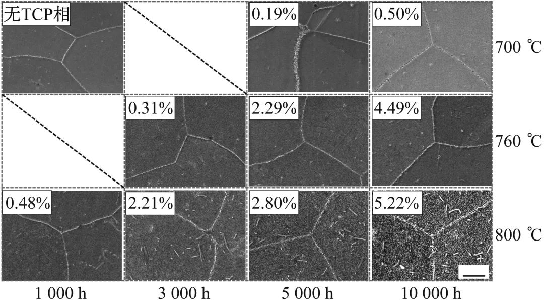 图6给出了对Haynes 282合金在不同温度下进行长期时效处理后的组织特征,图中各数值表示面积占比。从图6可以看出,在700 ℃下经过1 000 h长期时效处理后没有观察到针状μ相析出,但在700 ℃下经过5 000 h长期时效处理后出现了少量的针状μ相。整体来看,在700~800 ℃下经过长期时效处理后Haynes 282合金中析出针状μ相,且温度升高和时效时间延长加剧了针状μ相的析出。