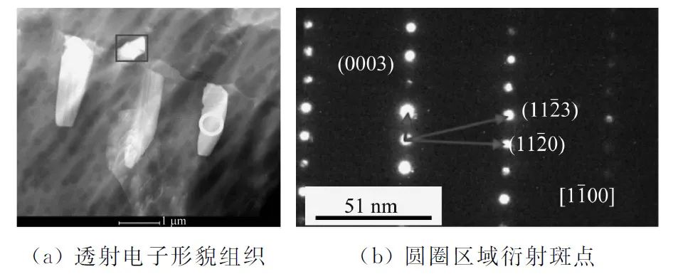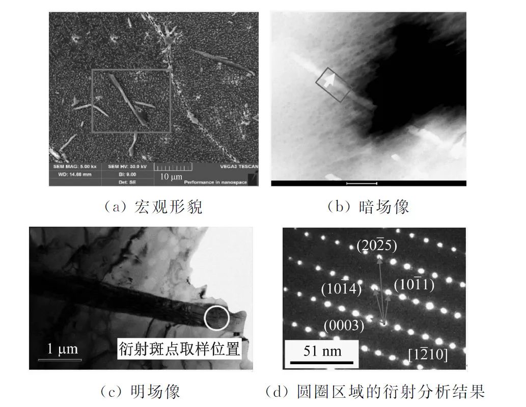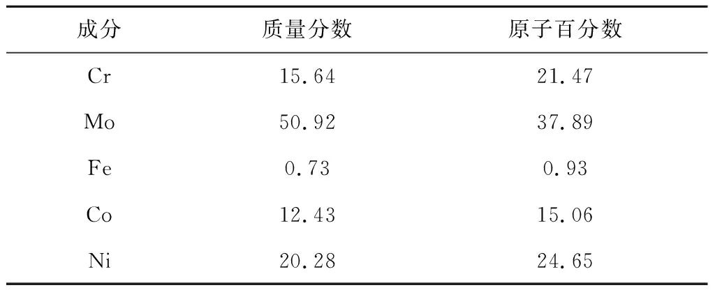 图9给出了长条状μ相的TEM分析结果。这类μ相长度约为10~20 μm。根据EDS分析结果,长条状μ相中Cr+Mo原子数量占比(简称原子百分数)为59.90%,Ni+Co原子百分数为40.11%,而μ相中Cr+Mo与Ni+Co原子百分数之比为60∶40,符合A3B2型μ相的成分特征,即为(Cr,Mo)3(Ni,Co)2。分别对衍射斑点进行测算,并标定μ相,其晶格常数为a=b=4.720 Å,c=25.394 Å,c/a=5.38。