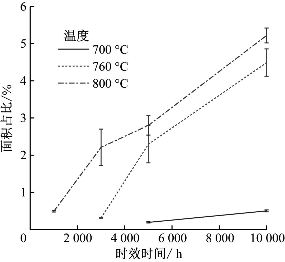为了分析Haynes 282合金经过长期时效处理后针状μ相的尺寸、数量和分布特征,对其尺寸和面积占比进行统计。图7给出了Haynes 282合金经长期时效处理后针状μ相面积占比随时效时间的变化。针状μ相的面积占比随时效时间的延长呈逐渐增加的趋势;同时,在700~800 ℃温度范围内,随着温度的升高,针状μ相的面积占比也逐渐增大。这说明针状μ相的尺寸和数量同时受到温度和时效时间的影响。温度升高,针状μ相的数量和尺寸明显增大;时效时间延长,针状μ相也会长大。由图7可知,在800 ℃下时效时间从5 000 h延长至10 000 h时,针状μ相的面积占比由2%~2.5%快速增至4.5%~5%。