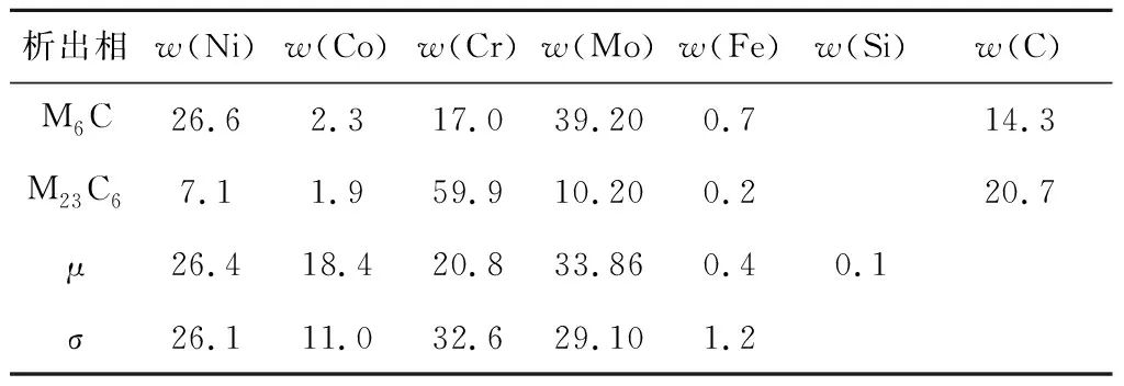 结合图3~图5可以看出,M23C6相主要分布在晶界,TiC相随机分布在晶内,部分分布在晶界,而Haynes 282合金显微组织中存在的相当数量的针状相为TCP型μ相。