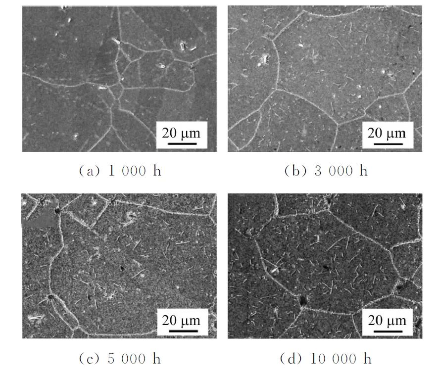 图6 Haynes 282合金在不同温度下经过长期时效处理后的组织特征