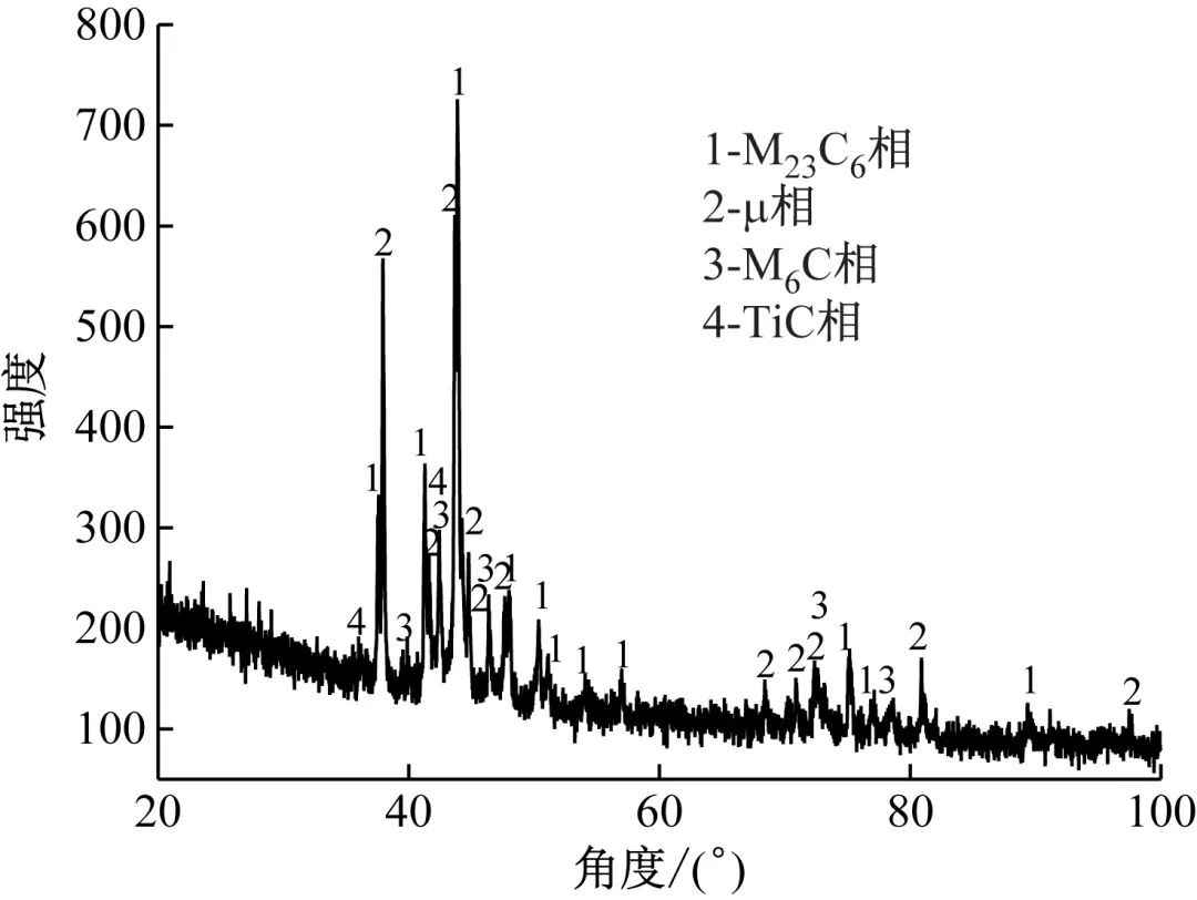 为了确定析出针状相的类型,对800 ℃下经过5 000 h长期时效处理的试样进行电解萃取和X射线衍射相鉴定。Haynes 282合金中的析出相特征见表4,X射线衍射图谱见图5。Haynes 282合金中主要存在M23C6相,以及部分M6C相和TiC相,3类碳化物均属于面心立方结构。特别要指出的是,Haynes 282合金中存在TCP型μ相,属于三角晶系。