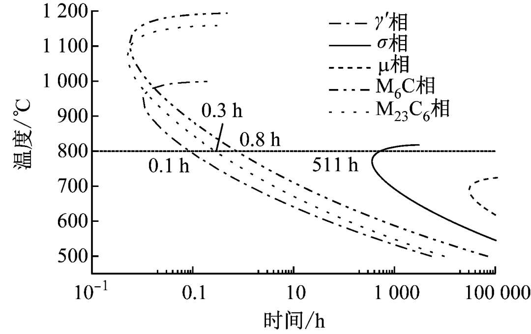 图2为Haynes 282合金等温时效组织转变曲线(TTT曲线)的计算结果。Haynes 282合金中出现了γ′相、M23C6相和M6C相,在高温长期时效处理后也会形成σ相和μ相。在800 ℃下,M23C6相和M6C相分别在0.3 h和0.8 h后析出,经过511 h时效后会析出σ相和TCP型μ相。重型燃气轮机燃烧室使用的高温合金材料设计寿命大于50 000 h,通过TTT曲线可以预测Haynes 282合金在长期使用过程中可能会析出TCP相,表明该合金的组织具有不稳定性,这会影响其高温力学性能。因此,有必要验证Haynes 282合金在高温长期时效处理和持久试验条件下的组织稳定性,以阐明该种高温合金材料应用的可行性。