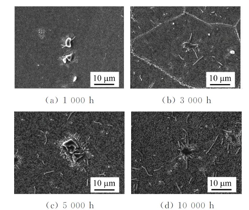 图3和图4分别给出了Haynes 282合金在800 ℃下经过长期时效处理后的组织特征以及MC碳化物的分解特征。由图3和图4可知,随着时效时间的延长,MC碳化物的分解逐渐加剧;时效时间为1 000 h时,MC碳化物初步分解,从MC碳化物的原位开始向晶内延伸出针状相,在晶粒内存在少量尺寸较小的针状相,此外在Haynes 282合金凝固结晶时析出的一次MC碳化物也出现分解;当时效时间达到3 000 h时,由MC碳化物分解产生的针状相尺寸增大,说明在800 ℃下经长期时效处理后针状相会逐渐长大;当时效时间达到5 000 h时,从MC碳化物分解出的针状相数量增多,且变粗、变长,逐渐向四周呈现放射状分布;当时效时间达到10 000 h时,晶粒内部出现大量尺寸很大的针状相,且由MC碳化物分解的细长针状相逐渐转变为纺锤形的短棒状相。整体来看,Haynes 282合金在800 ℃下时效时间越长,针状相的数量越多,该现象充分说明了其组织的不稳定性。