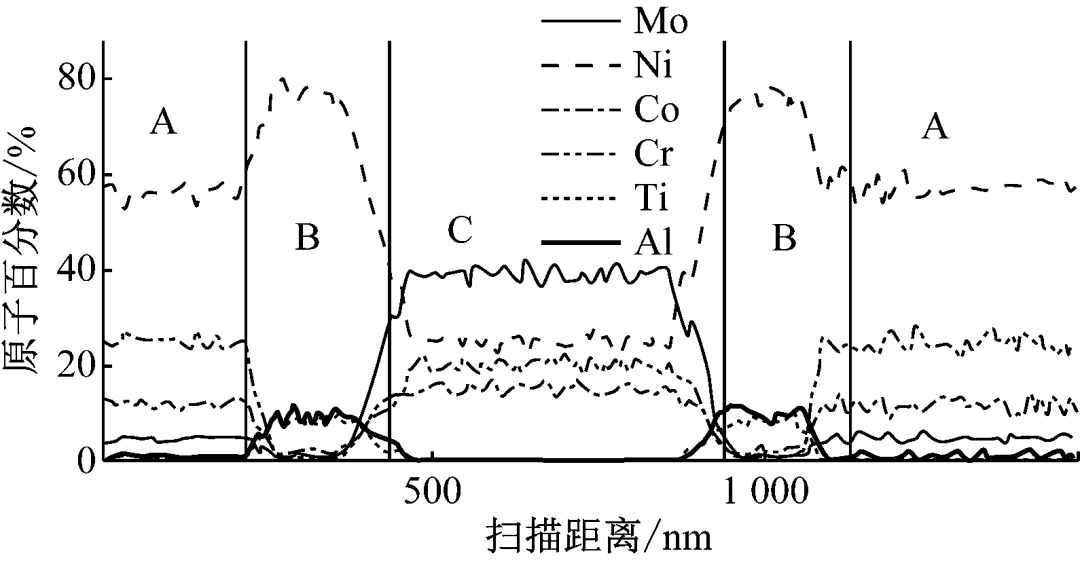 长条状μ相的X射线能谱法(EDX)线扫描结果见图10。从图10可以看出,Haynes 282合金中长条状μ相富含Mo、Cr和Co元素,且在长条状μ相两侧出现Mo、Cr和Co元素的贫化现象。根据EDX线扫描结果,可以将长条状μ相分为A、B和C 3个区域。其中,A区属于基体γ相,C区属于μ相,而B区极为特殊,其成分接近γ′相。长条状μ相两侧附着有大量的γ′相,这是由于长条状μ相在基体中生长时,μ相中的Al、Ti和Ni元素会向两侧扩散,基体中的Mo和Co元素会通过扩散向该处汇集,因此在γ相与μ相间会存在一个过渡区,该过渡区的成分与γ′相相似。