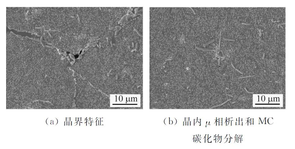 图8给出了在持久试验条件为800 ℃/130 MPa、持久断裂时间为6 752 h时Haynes 282合金析出相的组织特征。从图8(a)可以看出,在三叉晶界处具有明显的蠕变孔洞,在晶界上也有明显的裂纹。如图8(b)所示,在晶粒内部出现MC碳化物的分解,且可以观察到有一定数量的针状μ相析出。