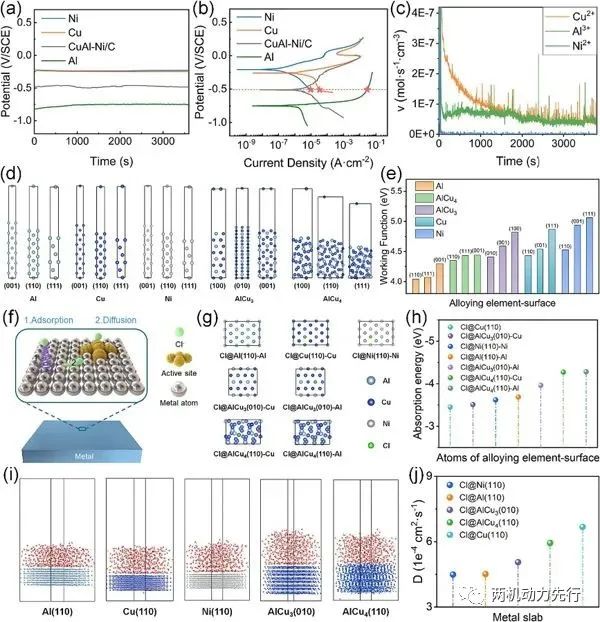 ▲图2.(a-b)OCP曲线及极化曲线(c)原位ICP-OES测试结果(d-e)功函数计算模型及其结果(f)Cl-离子与金属表面相互作用示意图(g-h)吸附能计算模型及其结果(i-j)扩散系数计算模型及其结果