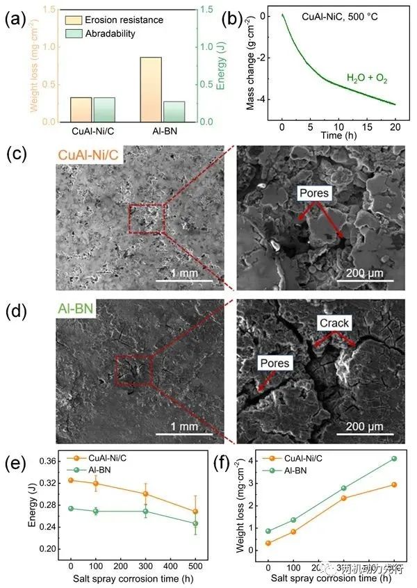 ▲图1.(a)两种封严涂层综合力学性能评价(b)CuAl-Ni/C涂层的高温性能评价(c-d)两种封严涂层盐雾试验后表面形貌(e-f)两种封严涂层腐蚀后综合力学性能评价