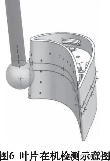 如图6所示,采用RMP40测头,φ6 mm测球在线检测,在叶尖邻近的2条截面各优化获得12个测量点,产生的测量数据文件可以反传回电脑软件系统,并依据测量数据在UG中自动生成加工模型。