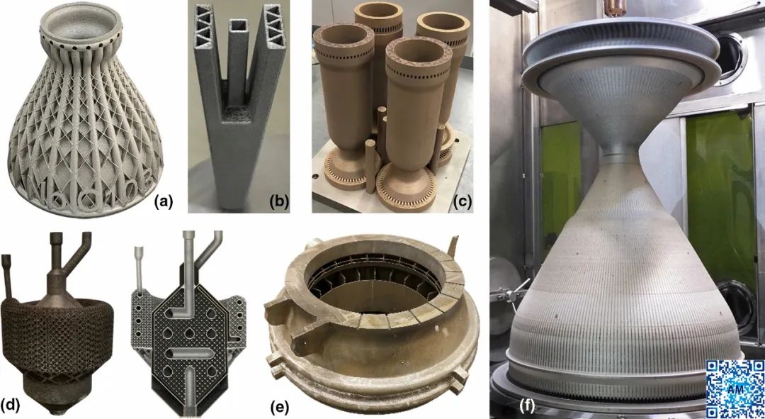 采用不同金属3D打印的复杂航空零件:(a)L-PBF打印的Nb C103主动冷却推进器 (b)L-PBF打印的钨主动冷却控制面(c)L-PBF打印的GRCop-84燃烧室(d)质量-优化的AlSi10Mg低温推进剂喷射器,外部有晶格结构,内部包含流道(e) L-PBF的直径600mm In718集成热交换器(f)LP-DED制造的NASA HR-1核热推进室